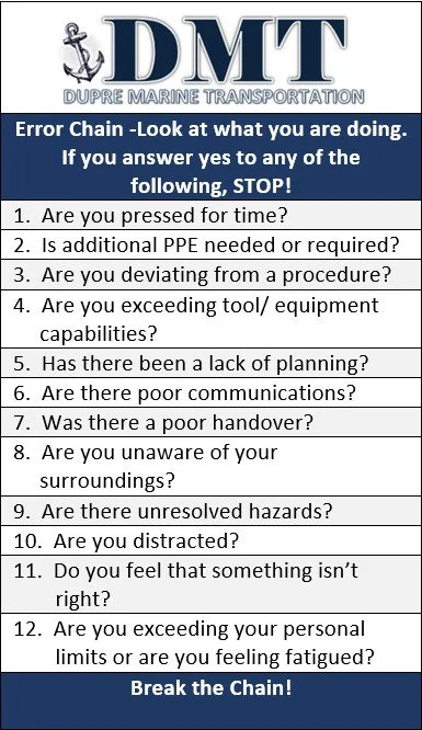 Remember to submit your Near Misses and Stop Work Responsibilities in Helm regularly. They are not only strong safety learning tools, but also recognized in the charter group and rewarded from Kirby Inland Marine. An important recognition!