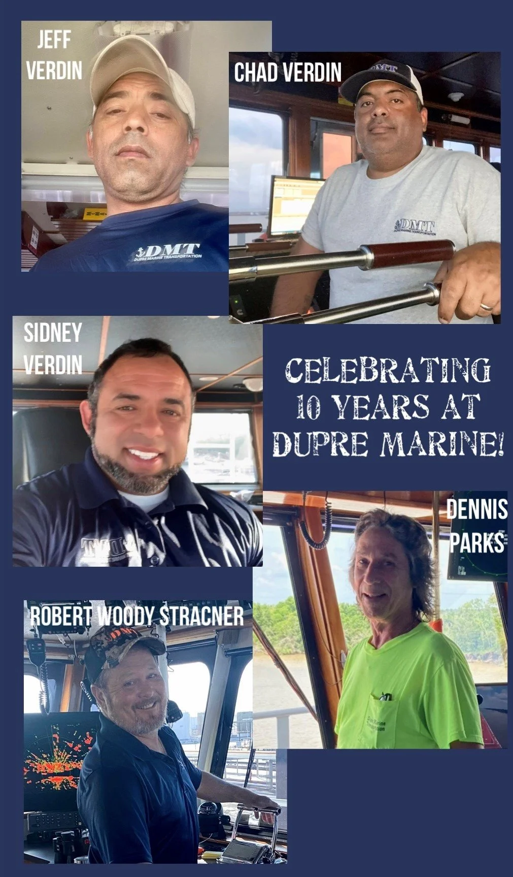 It is an honor for Dupre Marine Transportation to have these five wheelmen at the helm of our vessels for the past 10 years! They are truly exceptional and dedicated to their craft, ensuring the safety of their crews and boats over the past decade. In addition to their loyalty to Rory and Dupre Marine, each of these captains has a unique personality that adds to the strength and success of our company. They are all determined and succeed at being the best!