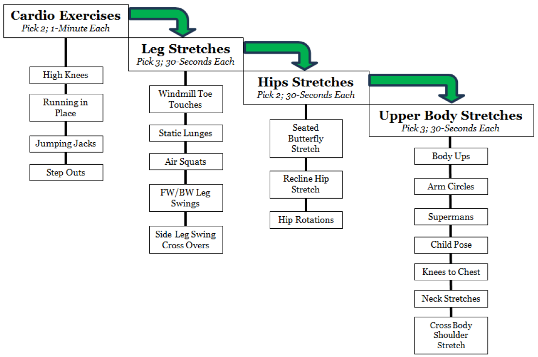 This is the breakdown of the stretches that can be done. As you see, there is a quick cardio to choose from then a variety to choose from for the leg, hip and upper body stretches. These will improve your flexibility and mobility and coordination.